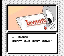 Birthday Blowout starts with a story about Bugs being invited to a special, fiftieth birthday party being thrown in his honour. The other Tunes are pissed that no one celebrates them the same way they do Bugs, so they set out to ruin his day on his way to his party. Think what you want of that plot, but ya gotta give it points for being different, if nothing else. In an era where seemingly every game had you rescuing a damsel or a princess or the like, Kemco thought outside the box.