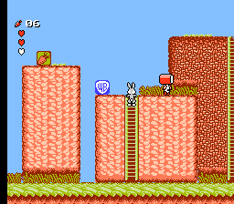 You see those carrots? Yeah, that’s the game’s currency. Grabbing one of them further turns the square space into a Warner Bros. symbol, which in itself is a platform, and you’d best believe they used that mechanic for the platforming layout in levels. The carrots themselves are collected so that they can be spent in a bingo game at the end of each level, where straight lines of three, four, or five will yield one, five, or fifty lives. At the end of whole worlds, that game becomes whack-a-mole, or more specifically, whack Willy the Weasel, whom you might know primarily from the Foghorn Leghorn shorts as the starving little critter that Foghorn uses to torment the farm’s protector dog. There’s more to be gained from the bingo games, but you have more control over your fate in whack-a-weasel. Suffice it to say, between both mini-games, there’s potential to rack up the extra lives.